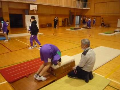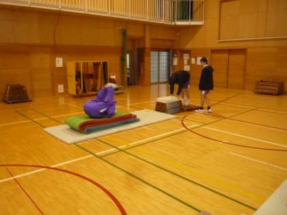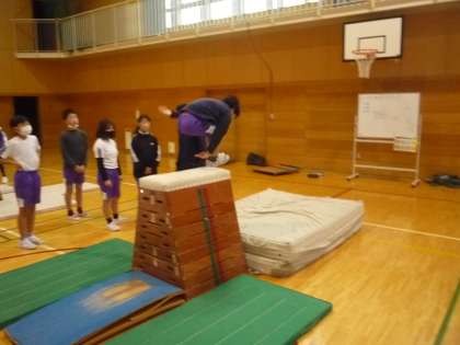 跳び箱運動の様子です。台上前転や抱え込み跳び、頭跳ね跳び等に挑戦しています。