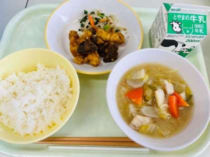 本日の献立は、ごはん、鶏肉とレバーのカレー風味、ナムル、たら汁、牛乳 です。