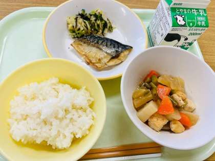 本日の献立は、ごはん、さばの塩焼き、いそ和え、大根と厚揚げの中華煮、牛乳 です。