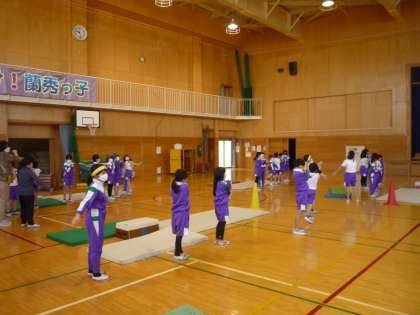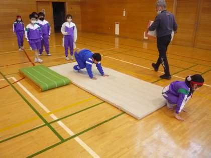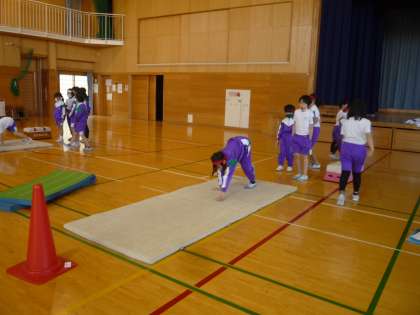 跳び箱運動の学習では、準備運動や動物歩き等で体をほぐしています。