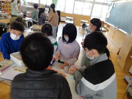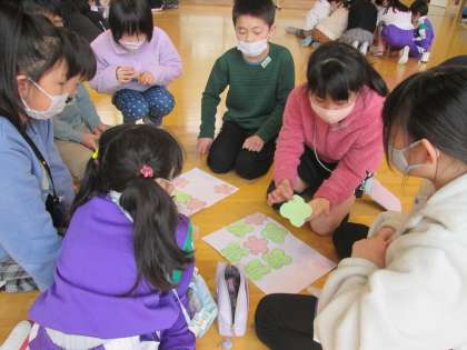 縦割り班で集まり、メッセージカードを一つにまとめました。6年生さんに喜んでもらえるように仕上げていきます。