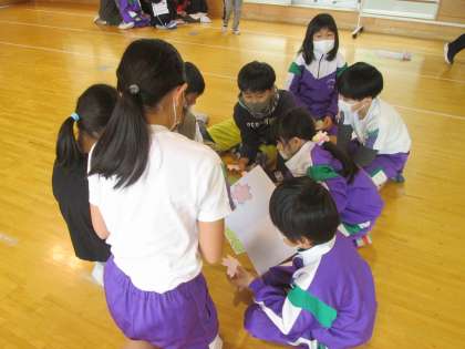 縦割り班で集まり、メッセージカードを一つにまとめました。6年生さんに喜んでもらえるように仕上げていきます。