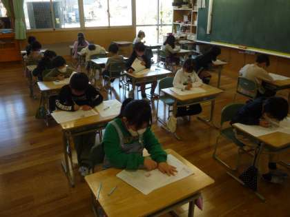 まとめテストに取り組んでいます。細かな文字の文章問題に苦戦しています。日頃から小さい字、少し長い文を読む習慣が大切です。