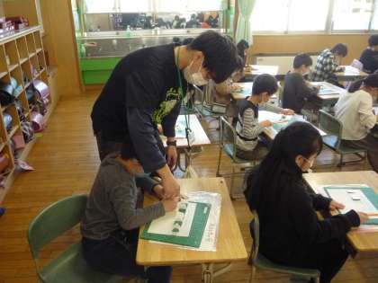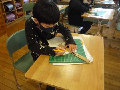 カッターの使い方を学習しました。手を切らないように、波線や円に沿ってきりり込みを入れています。