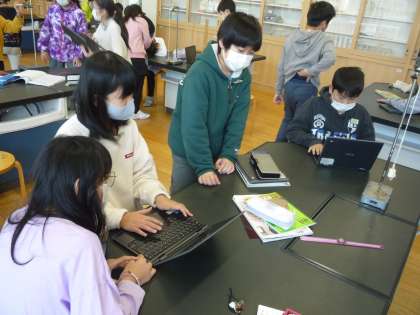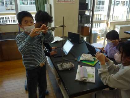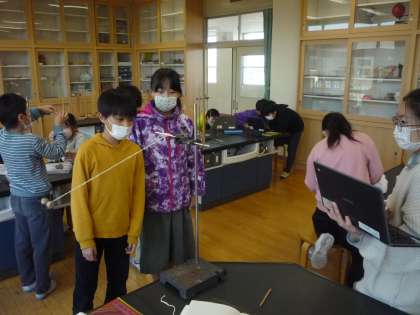 振り子の実験中です。クロムブックで撮影したり、時間を計測したりして、ひもの長さやおもりの重さでの違いを調べています。