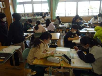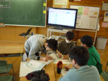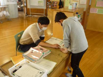 学習のまとめを友達同士でしています。分かったこと、学んだことを先生に確認してもらっています。