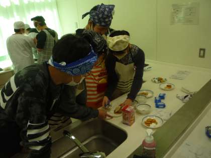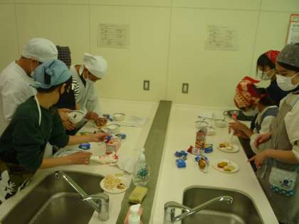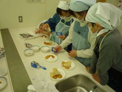 学級で感謝の気持ちを表した会食を開きます。クラッカーにジャムやクリームをのせました。