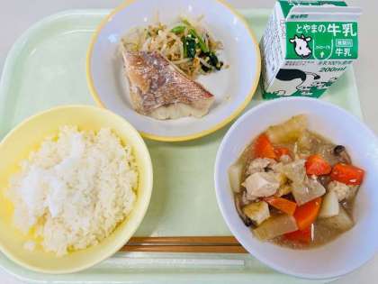 本日の献立は、ごはん、赤魚の塩焼き、炒り大豆和え、鶏肉と根菜のごま煮、牛乳 です。