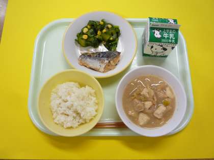 本日の献立は、ごはん、牛乳、さばのみそ煮、コーン和え、鶏肉と大根のごますき煮です。