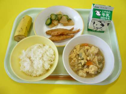 本日の献立は、ごはん、牛乳、わかさぎのフリッター、華風和え、厚揚げの錦とじ、バナナです。