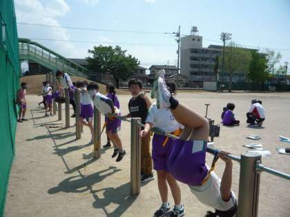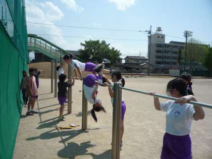 鉄棒運動に挑戦しています。できる技を増やし、どのような組み合わせにするか考えていきます。