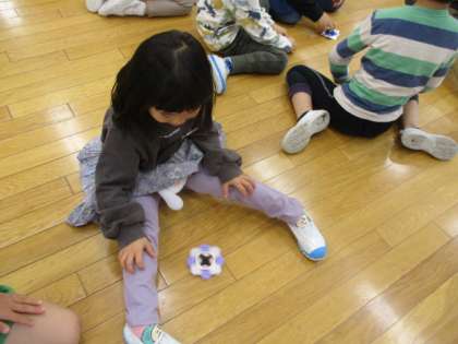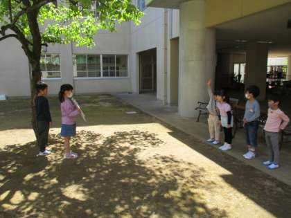 1年生さんに、これから習うことを教えようと縄跳びを行ったり、鍵盤ハーモニカを演奏したりしました。中庭にある木は、「何の木でしょう」という問題もありました。最後に、2年生から1年生さんに折り紙で作ったこまのプレゼントをしました。