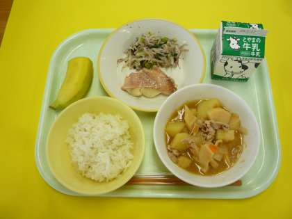 本日の献立は、ごはん、牛乳、赤魚の塩焼き、ゆかり和え、豚肉とじゃがいものうま煮、バナナです。