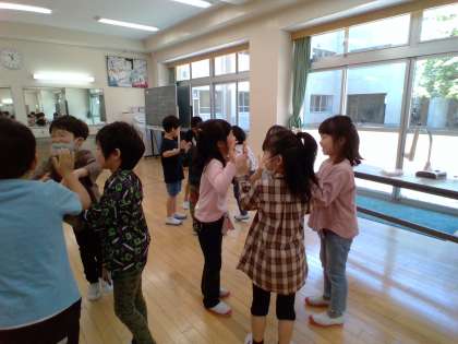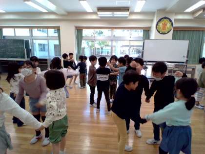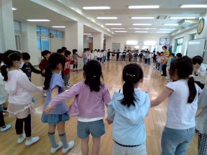 1年生の音楽の学習の様子です。うたに合わせて体を動かし、みんななかよくなりました。
