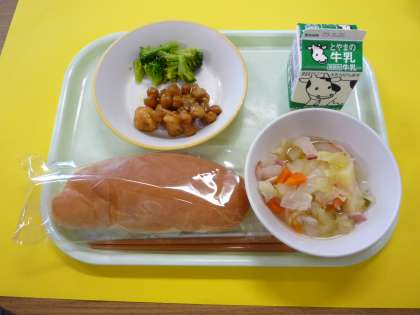 本日の献立は、ごはん、牛乳、鶏肉とひよこ豆のカレー風味、ゆでブロッコリー、野菜のスープ煮です。