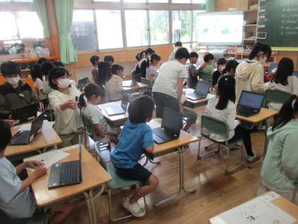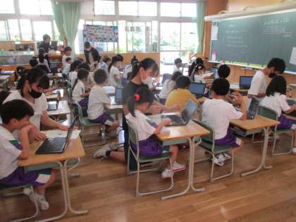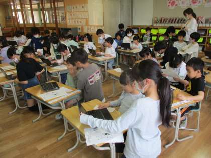 今日1年生が、初めてパソコンを使用しました。その際に必要なログイン等の方法を6年生がそばについて教えました。1年生にとっては難しい説明を、易しい言葉に変えて説明するなど、素敵な姿がたくさんありました。
