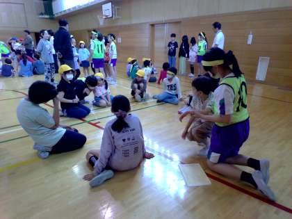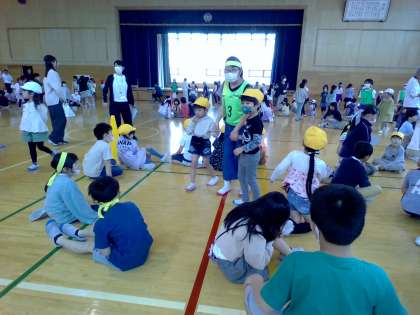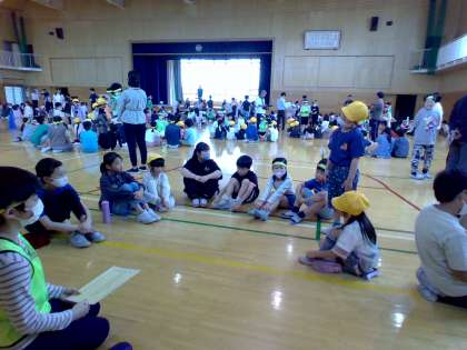 縦割り班活動の最後には、班で輪になって自己紹介をしました。恥ずかしがる1年生のそばについて励ましたり、手を引いて教室に連れて行ったりする優しい6年生の姿が見られました。