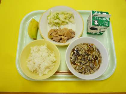 本日の献立は、ごはん、牛乳、あっさりチキン、そえ野菜、たまごともずくのスープ、バナナです。