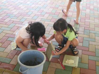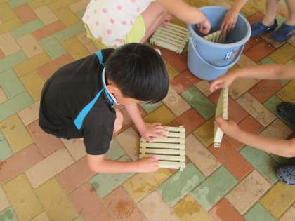 プール開きに向けて、プールの溝のふたを掃除しました。ふたの細かい部分まで一生懸命にみがいてピカピカにすることができました。