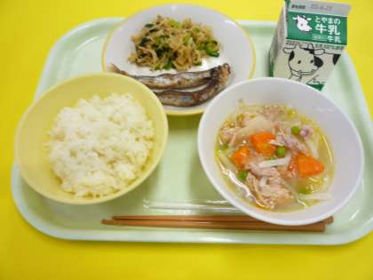 本日の献立は、ごはん、牛乳、ししゃものから揚げ、はりはり和え、塩肉じゃがです。