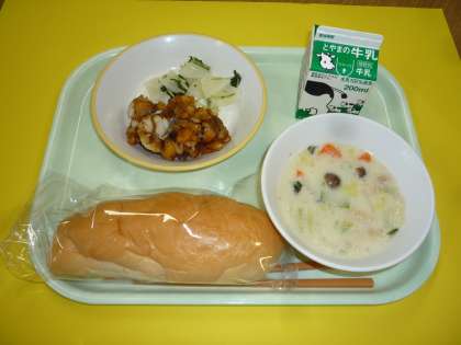 本日の献立は、米粉コッペパン、牛乳、魚と大豆のえごまだれがらめ、かぶのサラダ、白菜の中華クリーム煮です。