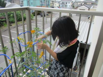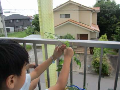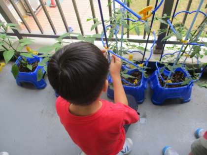 2年生は、自分で選んだ野菜を毎日大切に育てています。今回は、野菜に名前を付けて、名札作りをしました。きゅうりやピーマンの実を収穫した子供もいました。