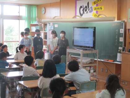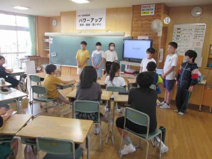 宿泊学習を終えて「5年生に伝えたいこと」の学習では、宿泊学習で成功したことや次に生かしたいことをスライドにまとめました。自分たちの振り返りをもとに、5年生の宿泊学習が成功してほしいと願いをもち、伝えることができました。