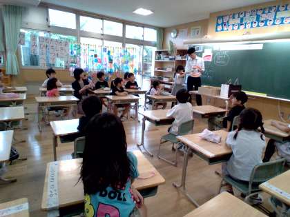 1年生は学級活動「むしばをふせごう」の学習をしていました。どこを磨いたらよいか、葉の模型を使って考えていました。