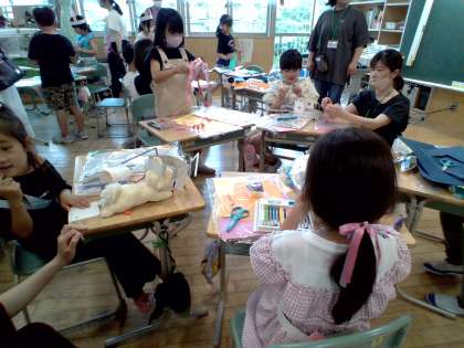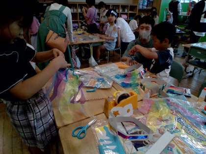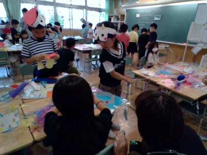2年生は図工「わっかのへんしん」の学習をしていました。うさぎやたぬき、ねこやプリンセス、くらげなど思い思いの変身を楽しんでいました。