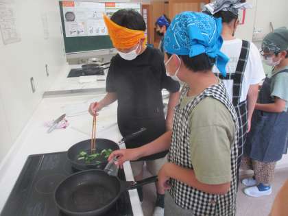 6年生の最初の調理実習では、青菜の油いためとスクランブルエッグを作りました。忙しい朝でも、簡単に調理できることを学びました。火加減に気を付け、ちょうど良い歯触りになるよう意識していためることができました。