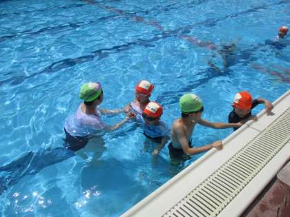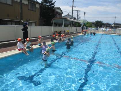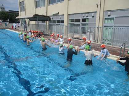 1年生にとって初めてのプール学習は6年生と一緒に行いました。自分で水をかけたり、6年生に手を引いてもらったりして、水に慣れるようにしました。「まだまだ入っていたい」と話すなど、楽しく活動できました。