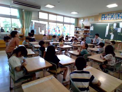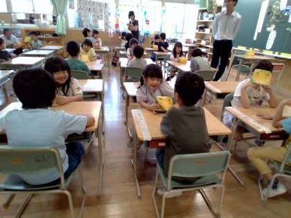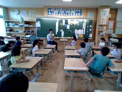 1年生は道徳「かぼちゃのつる」を学習していました。自分のわがままでみんなに迷惑をかけてしまった「かぼちゃ」さんにアドバイスをするペアでの役割演技では「お話できた」と嬉しそうな声が聞こえてきました。