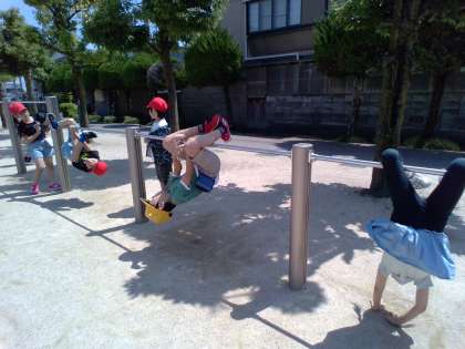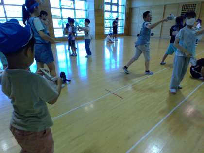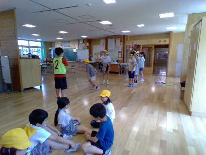 蘭州タイムのたてわり体力つくりの様子です。6年生が下の学年に教えながら活動しています。