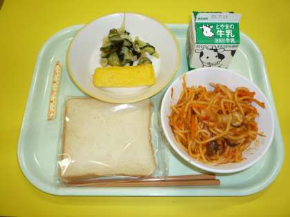 本日の献立は、食パン(減)、牛乳、ツナとトマトのスパゲッティ、卵ロール、海藻サラダ、棒チーズです。