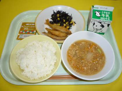 本日の献立は、ごはん、牛乳、わかさぎのフリッター、ひじきのごま和え、冬瓜のそぼろあん、野菜ふりかけです。