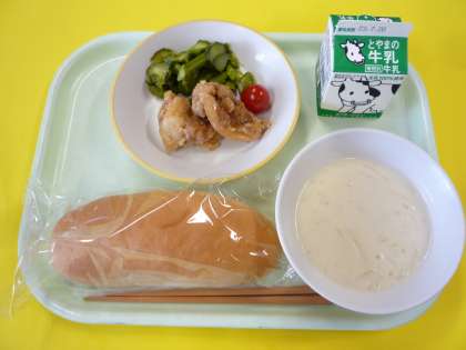 本日の献立は、コッペパン、牛乳、フライドチキン、アスパラサラダ、ビーンズポタージュ、ミニトマトです。