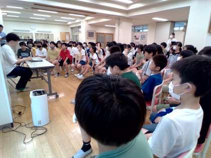 山室小学校の卒業生の平野先生が漫画家になるまでのお話や、漫画家になってからの生活についてのお話を聞きました。読者に喜んでもらうったときの嬉しい気持ちなど、仕事に対する思いについてお話していただきました。