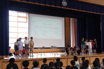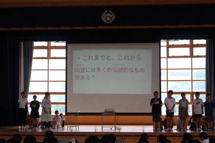 総合的な学習の時間に調べてきた山室小学校のことについて、創校記念式典の中で発表しました。たくさんの人に伝わるようにスライドの表し方や話し方を工夫して臨むことができました。
