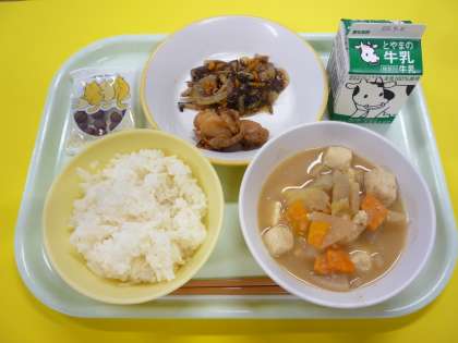 本日の献立は、ごはん、牛乳、ホタテの香味焼き、もずくのチャプチェ、ごまけんちん、黒糖大豆です。