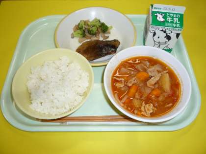 本日の献立は、ごはん、牛乳、あじのみりん焼き、ブロッコリーとエリンギのソテー、トマト肉じゃがです。