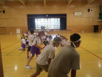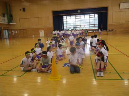 学年レクリエショーンで団別リレーやしっぽ取りを行いました。運動会に向けて、団の結束を高めています。