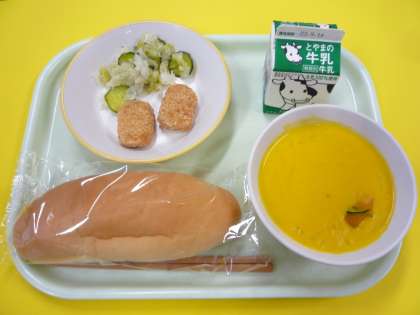 本日の献立は、コッペパン、牛乳、チキンナゲット、えごまドレッシングサラダ、かぼちゃポタージュです。