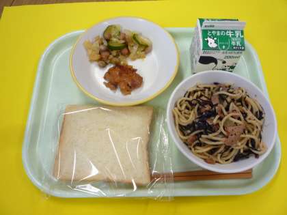本日の献立は、減量食パン、牛乳、照り焼きチキン、ビーンズサラダ、ベーコンとひじきの和風スパゲッティです。
