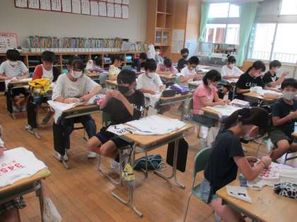 ゼッケンを体操服に付け、チャレンジ陸上記録会の準備を行いました。今までの練習の成果を発揮し、自分の記録更新を目指します。