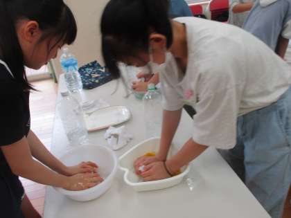 今日の家庭科では、運動会に使用する軍手と色帽子を手洗いしました。特に汚れている部分にはつまみ洗いをするなど工夫して取り組みました。汚れが落ち、洗剤液が汚れる様子を見て、達成感を感じました。