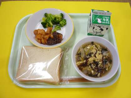 本日の献立は、食パン、牛乳、鶏肉とレバーのマーマレードソースからめ、ゆでブロッコリー、卵ともずくのスープです。