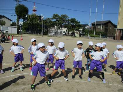 1・2年生は、「ぽかぽかダンシング玉入れ」を行います。歌に合わせてダンスを行い、間奏の間に玉入れを行います。玉を投げるのがどんどん上手になっています。