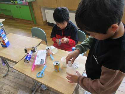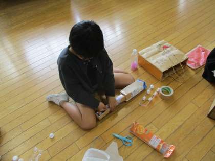 2年生は、図工で「音づくりフレンズ」を行いました。身近な材料を使って、ギターや太鼓、マラカスのような音を出す楽器を作りました。
