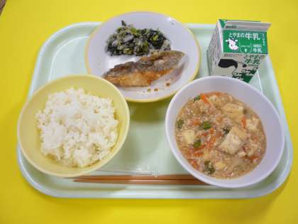 本日の献立は、ごはん、牛乳、揚げ魚のレモン味、よごし、厚揚げのそぼろ煮です。