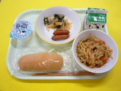 本日の献立は、減量コッペパン、牛乳、あらびきウインナー、こんにゃくサラダ、焼きそば、ヨーグルトです。